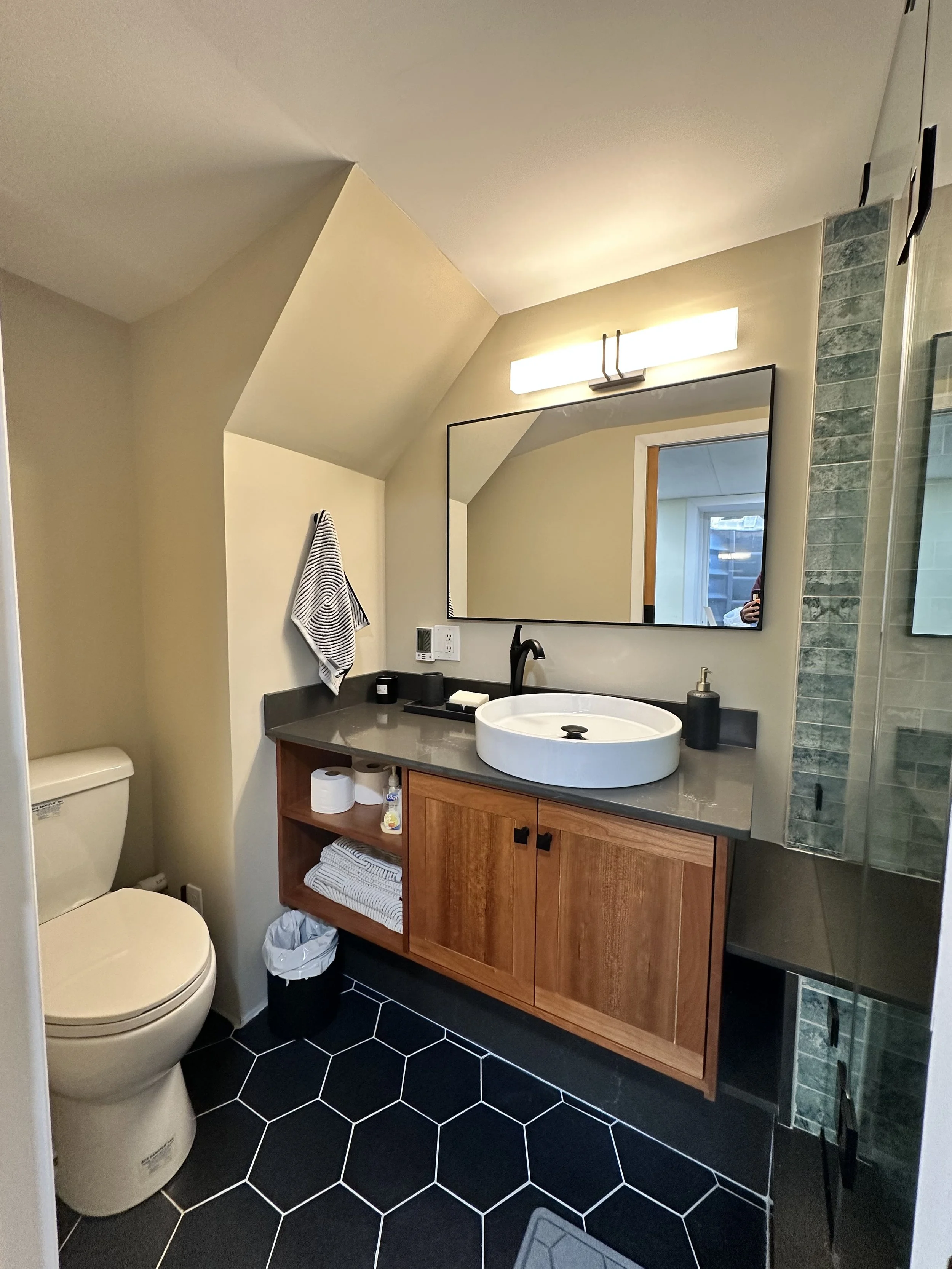 In addition to installing miscellaneous items, the major project (re-tiling 2 bathroom floors, modifying walk-in shower and installing 2 new vanities) was done expeditiously and nicely. Mr. Mitchell was also very patient with me, as I did need a litte assistance with picking floor tile.